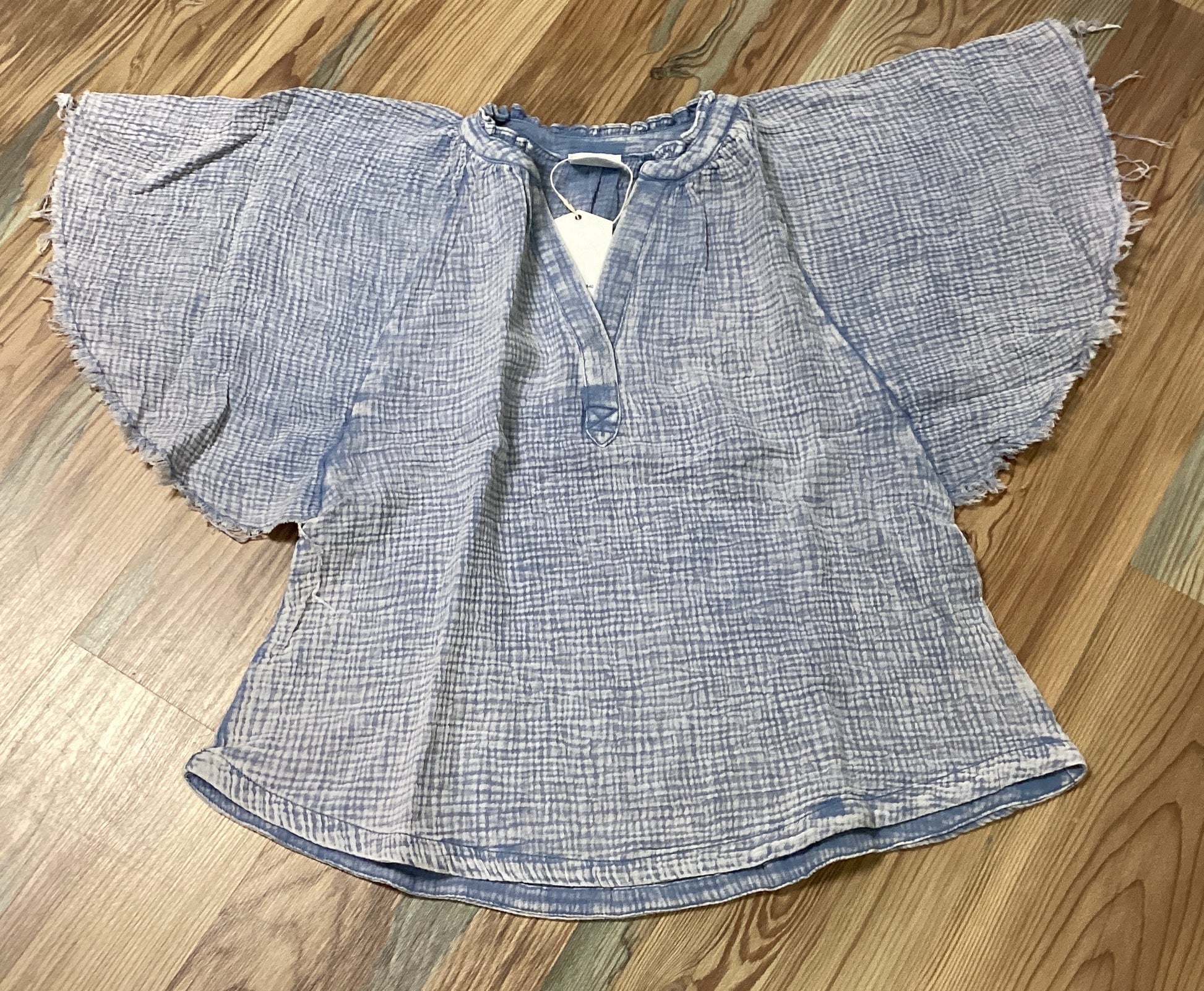 Soft And Effortlessly Chic, This Lightweight Chambray Style Top Features A Relaxed, Flowy Silhouette With A Textured Crinkled Fabric That Adds Natural Dimension. Designed With A Wide, Draped Neckline And Short Sleeves, It Offers An Easygoing Fit That’s Perfect For Warm Weather Styling. The Subtle Blue Tone Gives It A Coastal-Inspired Feel, While The Raw Edge Details Add A Touch Of Casual Charm. Pair It With Your Favorite Denim Or Linen Bottoms For A Laid-Back, Everyday Look.