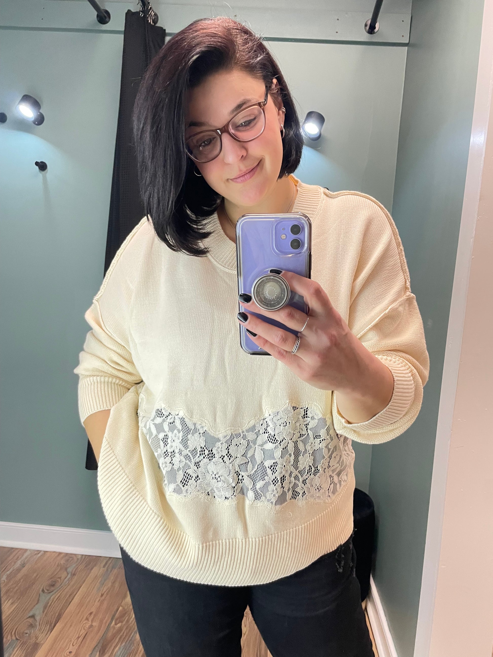 A Soft, Cream-Colored Knit Sweater Featuring A Relaxed, Slightly Oversized Silhouette. Designed With A Ribbed Crew Neckline, Hem, And Cuffs, This Sweater Combines Cozy Texture With A Feminine Touch. A Wide Horizontal Panel Of Delicate Floral Lace Runs Across The Chest And Back, Adding Light Contrast And An Elevated, Romantic Detail. Perfect For Pairing With Denim, Trousers, Or Skirts For A Chic Everyday Look.