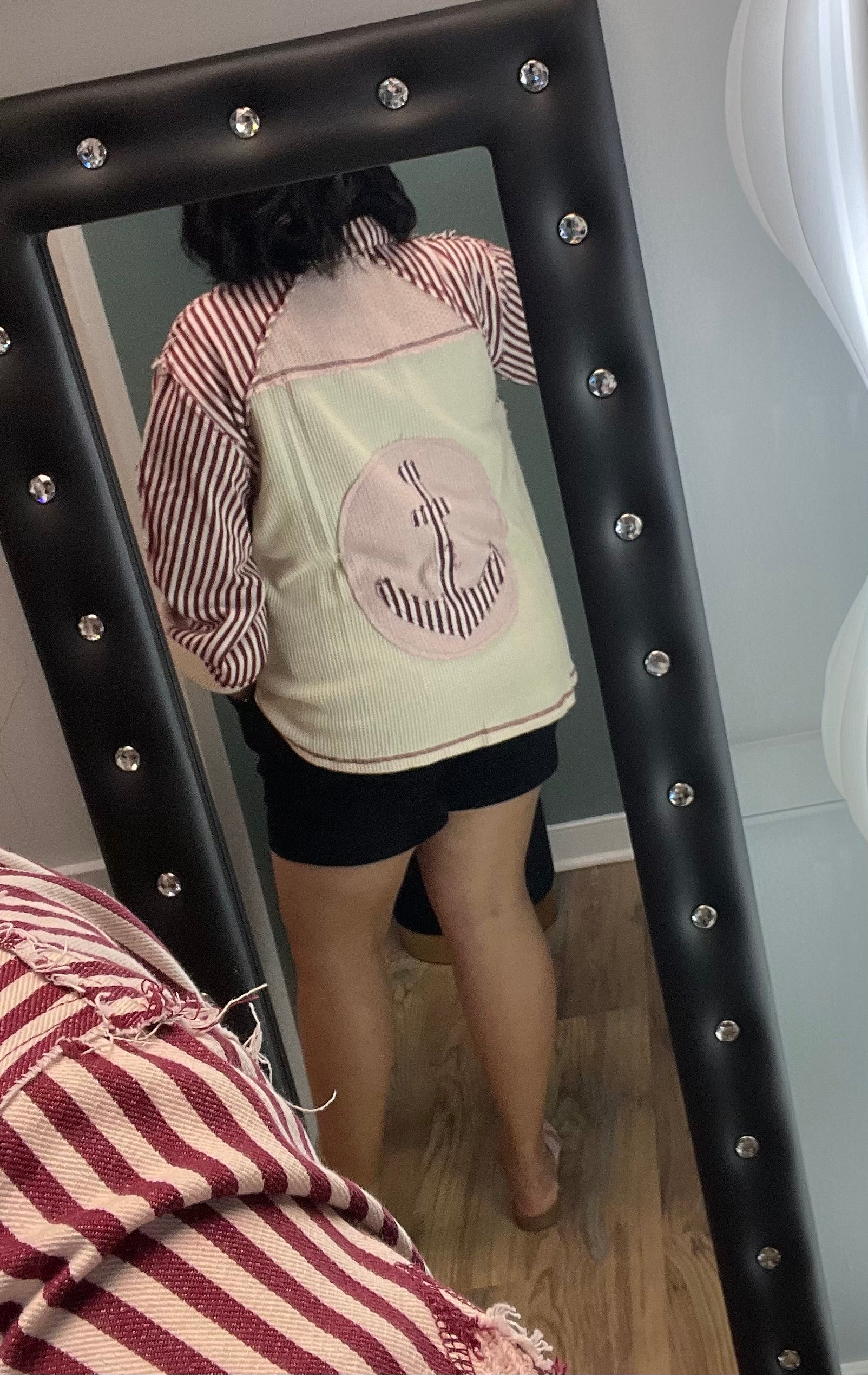 Get Ready To Rock The Nautical Look With Our Cream Red Anchor Button Down! This Collared Shirt Features A Bold Maroon And Cream Color Scheme, With Striped Detailing On The Shoulders, Chest Pocket And Arms. Plus, A Playful Anchor Design On The Back.