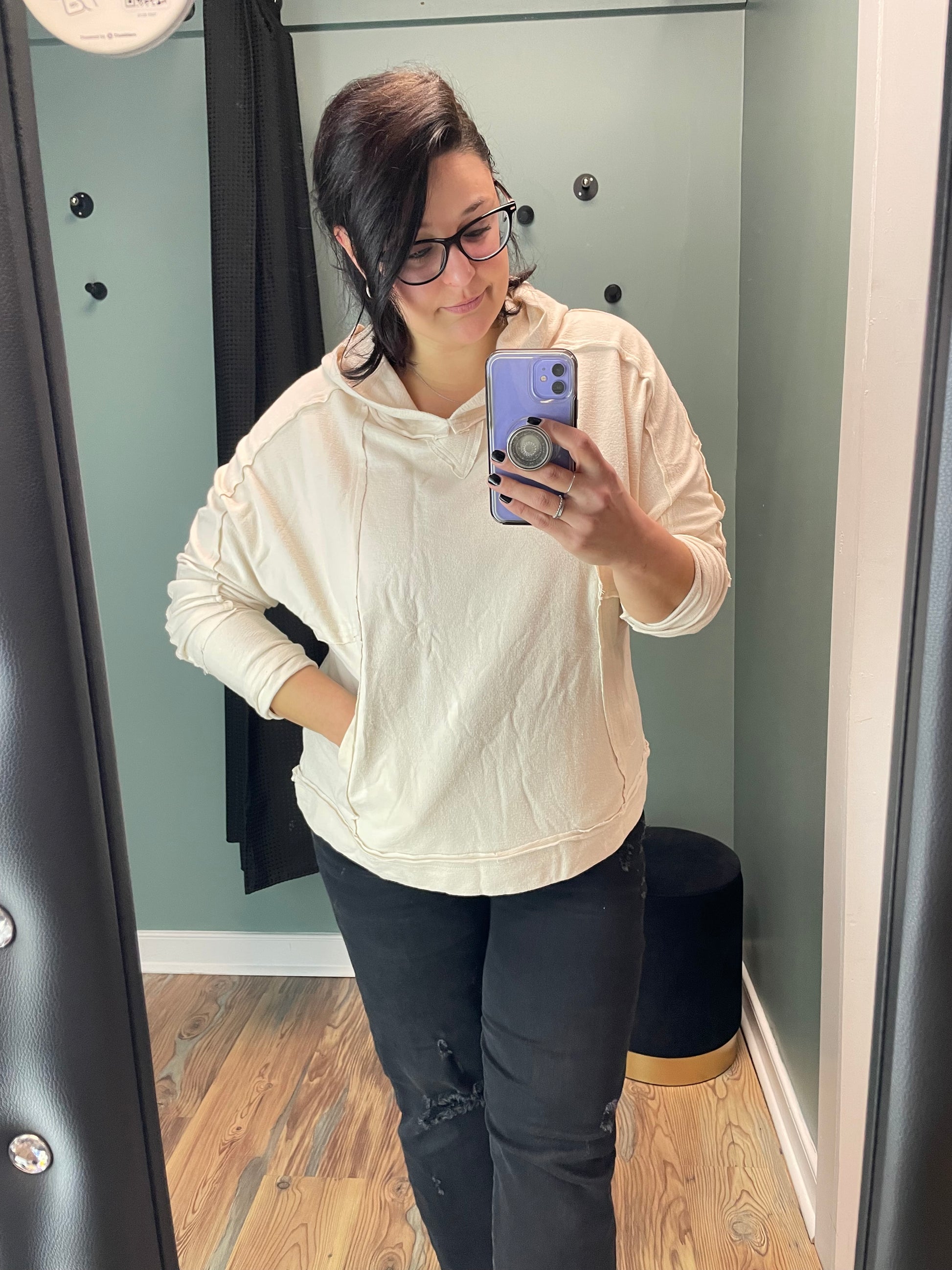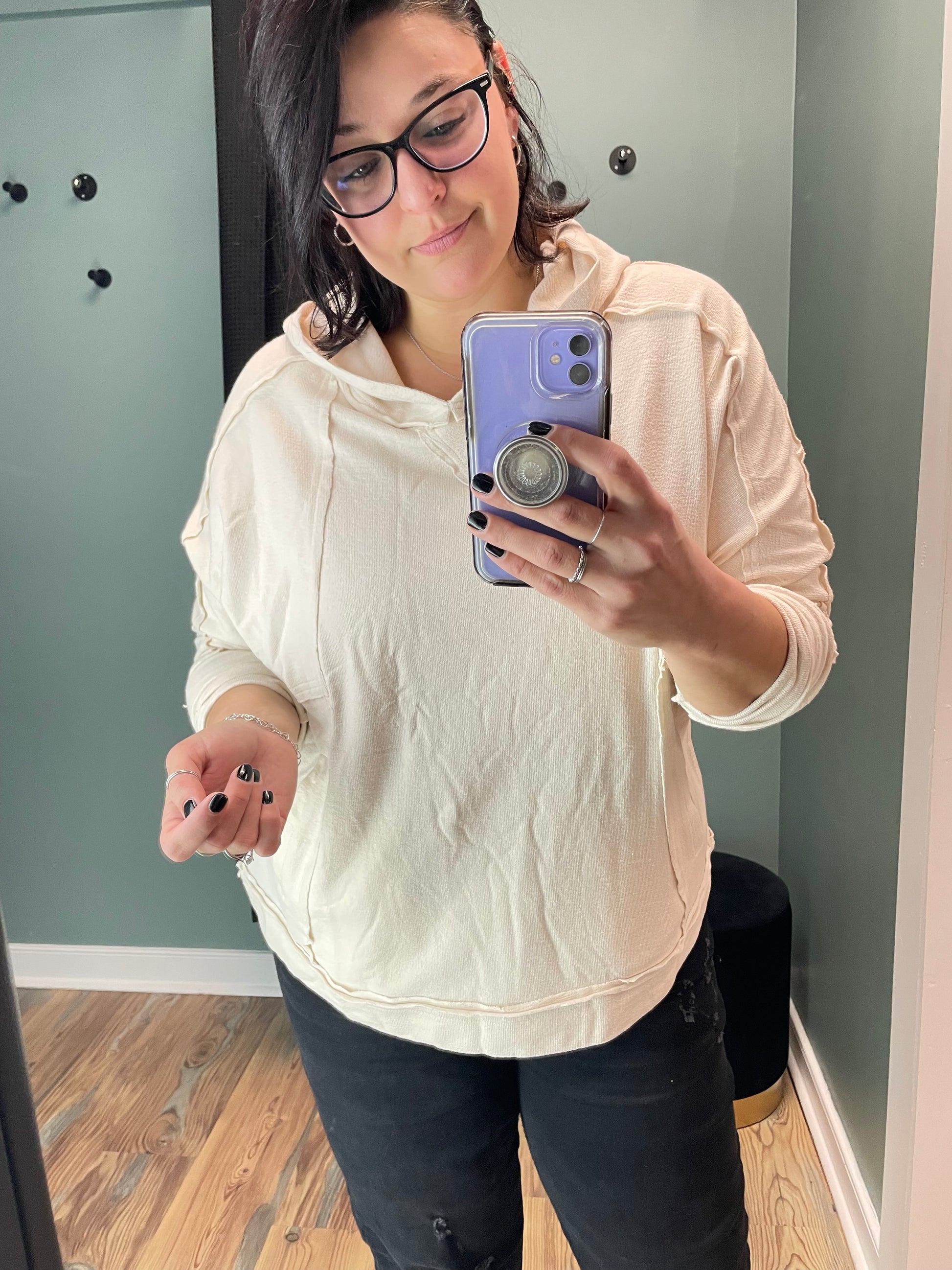 Soft And Effortlessly Stylish, This Cream-Toned Hoodie Is The Perfect Blend Of Comfort And Casual Chic. Designed With A Relaxed, Slightly Oversized Fit, It Features A Cozy Hood And A Minimalist Silhouette That Makes It Easy To Wear For Any Occasion. The Lightweight Fabric Offers Breathability While Still Providing A Soft, Cozy Feel, Making It Ideal For Layering Year-Round. Subtle Seam Details And A Clean Finish With Functional Pockets Add A Modern Touch To This Everyday Essential. Pair It With Jeans, Leggings, Or Lounge Pants For A Laid-Back Yet Polished Look.