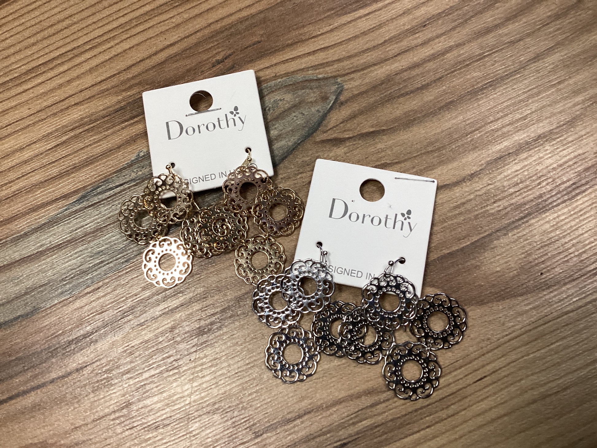 Add Sophistication To Any Outfit With Our Doily Tiered Dangle Earrings. Available In Silver Or Gold, These Earrings Are Sure To Add The Final Touch To Any Outfit.