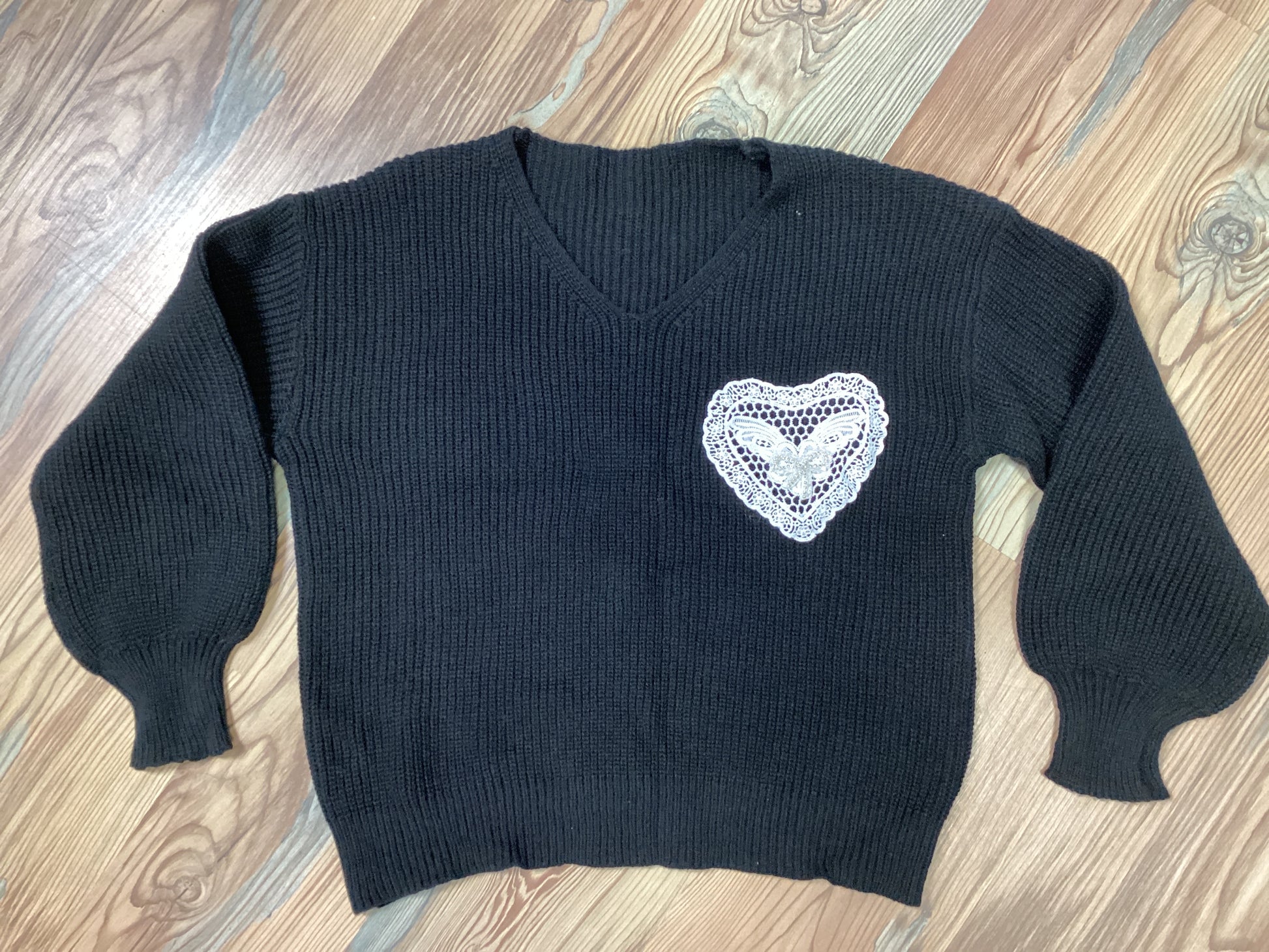 The White Lace Heart Pocket Black Knit Sweater Has A V Neck With A Rhinestone Bow Accent On The Lace Pocket. Looks Great For Evey Occasion.