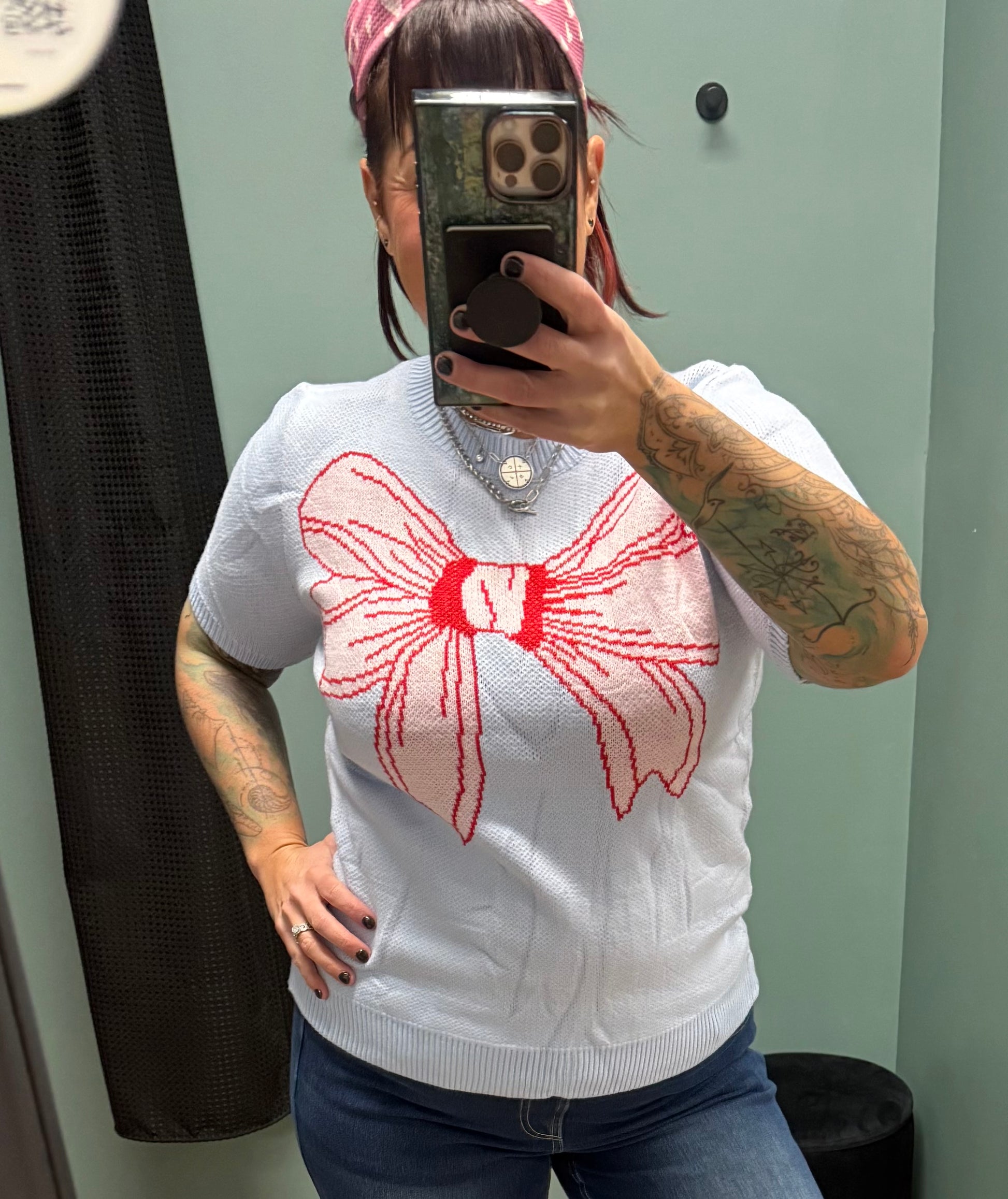 Get Ready To Have Your Wardrobe Do A Little Happy Dance. This Light Blue Short Sleeve Sweater, Complete With A Fab Big Pink Red Bow, Isn’t Just A Clothing Item, It’s A Conversation Starter. Perfect For Showing Off Your Playful Side While Staying Cozy.