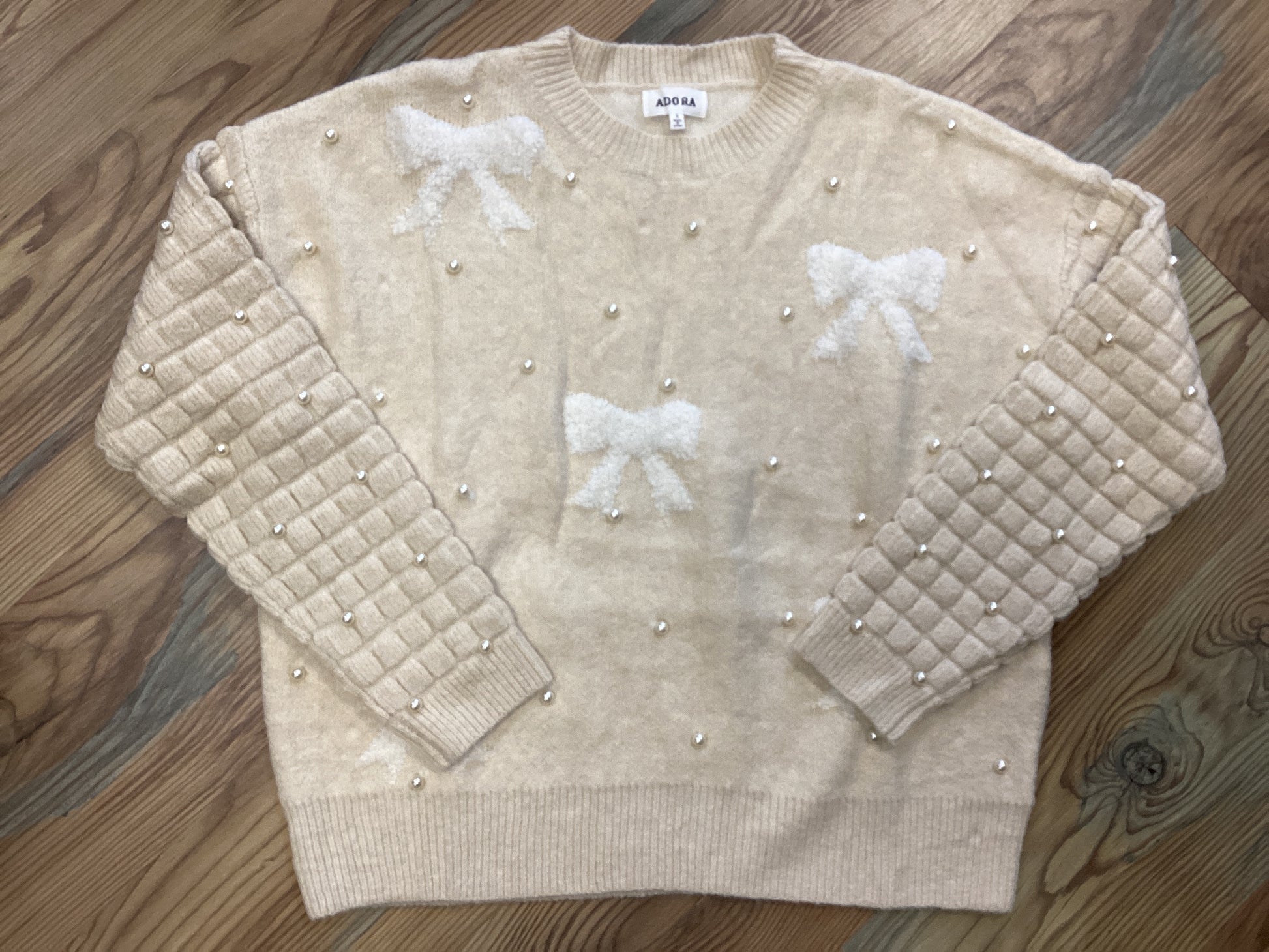 This Quirky Oatmeal Sweater Is Elevated With A Playful White Bow And Pearl Detailing. Stay Cozy And Stylish With This Unique Piece.