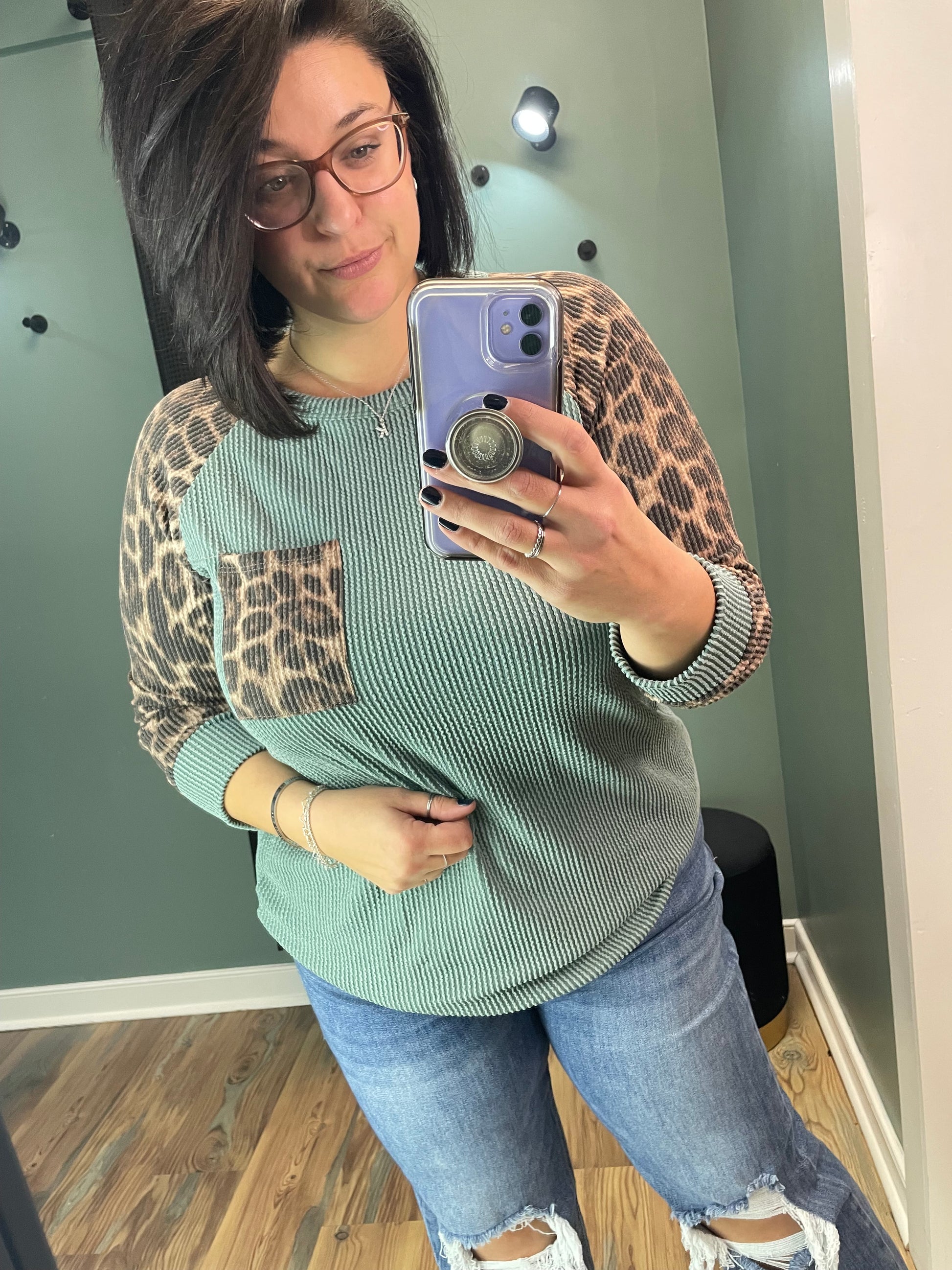 Ribbed Cheetah Sleeve Top Has A Pocket And Looks Great With The Color Block Of Teal.