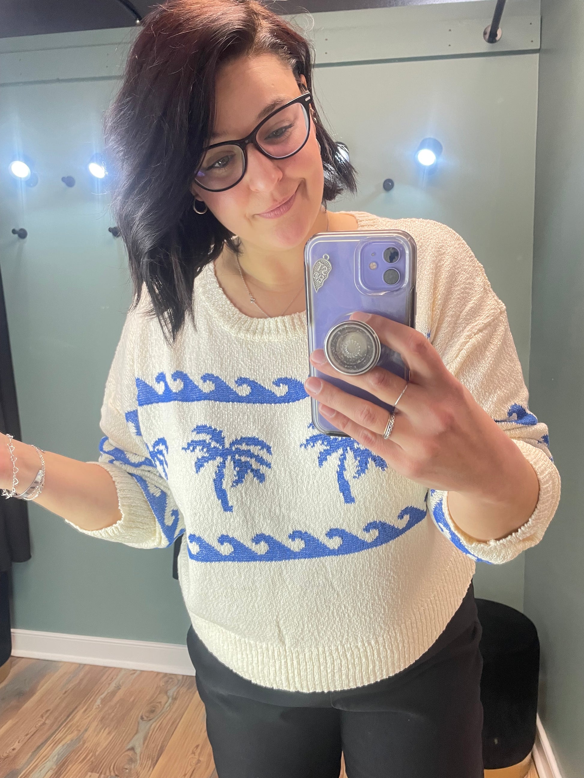 The Wave Palm Tree Knit Is A Dreamy Cream Sweater Jazzed Up With Funky Blue Waves And Palm Trees. This Beauty Boasts A Slight Crop And A Medium Weight, Breezy Knit That’s Perfect For Those In Between Season Shenanigans. It’s Quirky Design Gives It A One Of A Kind Flair, Making It Your Go To For Casual Hangouts Or Chill Vibes.